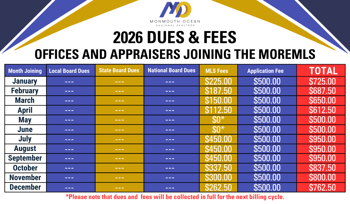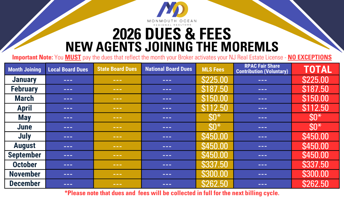 New agents need to complete the fillable application form. Dues and fees for NEW MEMBERS ONLY are prorated based on the date you join Monmouth Ocean Regional REALTORS®/MOREMLS.